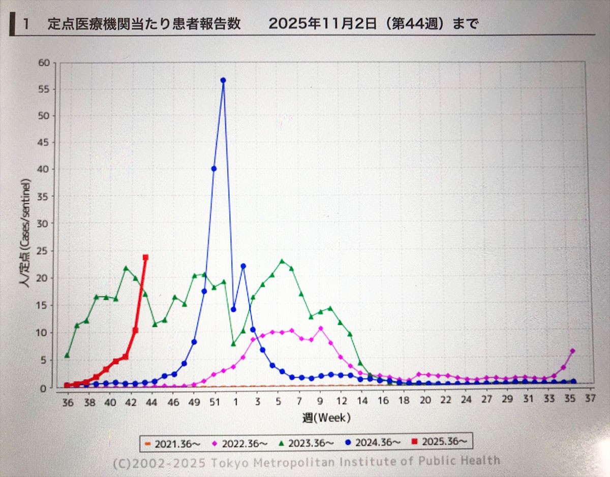 昨年より1ヵ月早く流行シーズンに入った要因として猛暑の影響、また大阪関西万博の影響で外国人観光客が増加したことも要因の1つとして考えられるそうです。